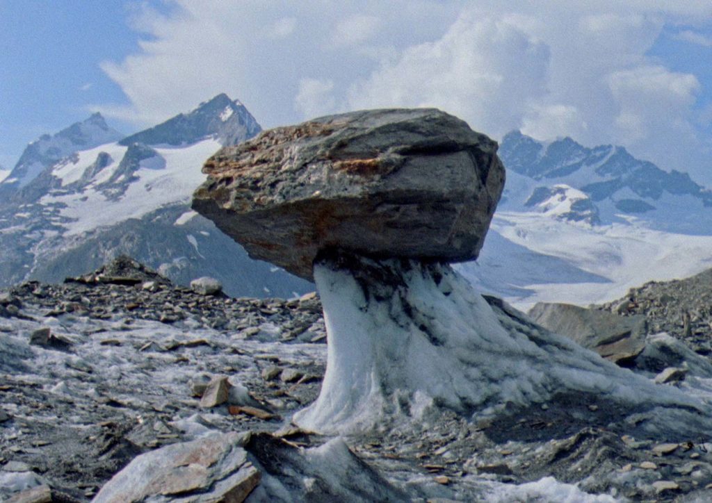 Le glacier est un géant qui semble être là depuis toujours, marqué de ses deux morraines longeant la coulée. Allure majestueuse, atemporelle d’un paysage en noir et blanc, il en impose. Il se révèle pourtant aussi fragile, les objets qu’ils recrache : boîtes de conserves carcasse d’un avion, sont la manifestation de la présence passagère, irrégulière de l’Homme et témoignent de sa fonte continue, irreversible. Symptôme évident d’une diminution incessante. Et pourtant il résiste.